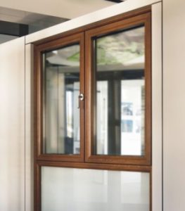 - Drvena masivna obloga sa unutrašnje strane je od tvrdog drveta (hrast, bukva, mahagoni…) zaštićena različitim tipovima akrilne zaštite izuzetne postojanosti. Drveni profili su postavljeni na aluminijumsku noseću konstrukciju poliamidnim patent spojnicama koje dozvoljavaju međusobnu dilataciju različitih materijala. Drvena obloga poboljšava termička i zvučna svojstva elementa. Dizajn drvene obloge je originalan i estetski jedinstven.